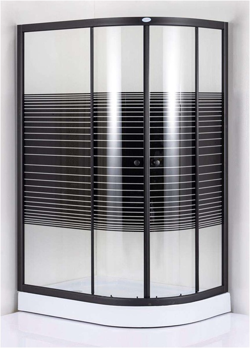 стекло 4 мм прозрачное с горизонтальными черными полосами, алюминиевый профиль черного цвета, высота поддона 13 см.