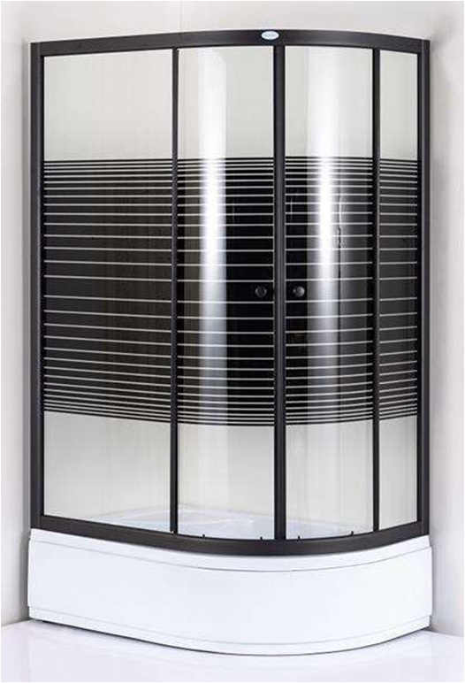 стекло 4 мм прозрачное с горизонтальными черными полосами, алюминиевый профиль черного цвета, высота поддона 30 см.