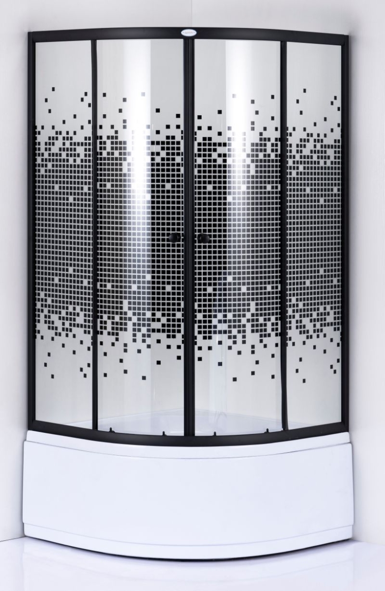 Профиль и дуги чёрного цвета. Стекло тонированное с нанесением пикселей. Толщина стекла 4 миллиметра. Высота поддона 38 см.
