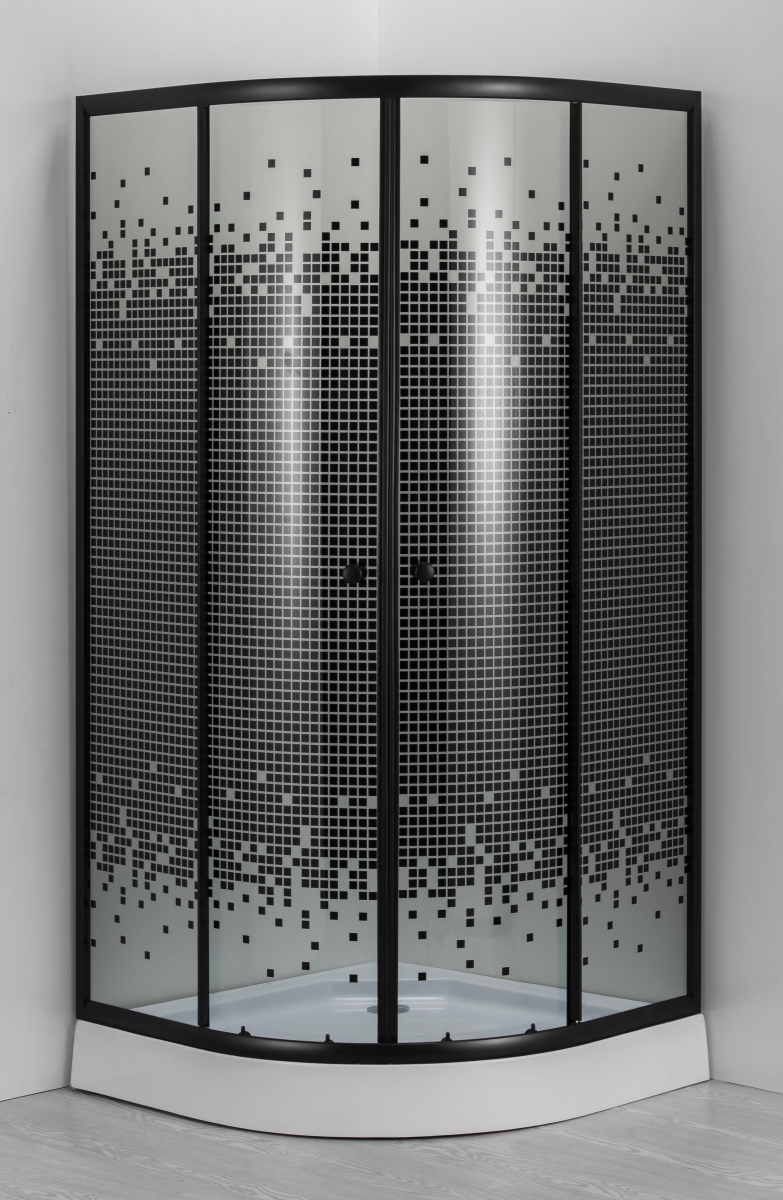 стекло 4 мм: прозрачное с узором ПИКСЕЛИ, алюминиевый профиль черного цвета, высота поддона 13 см.