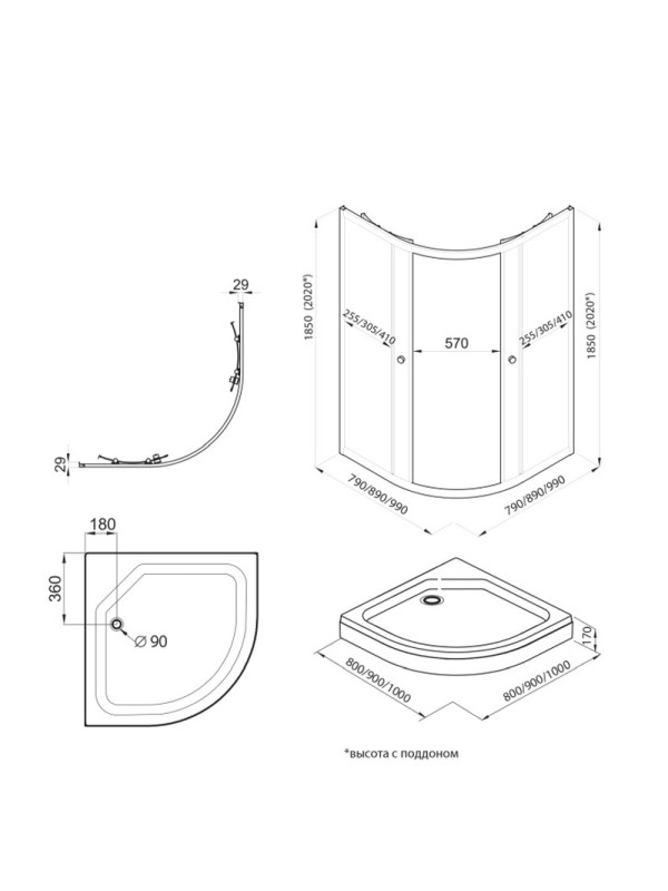 Высота кабины, поддона, мм 1850