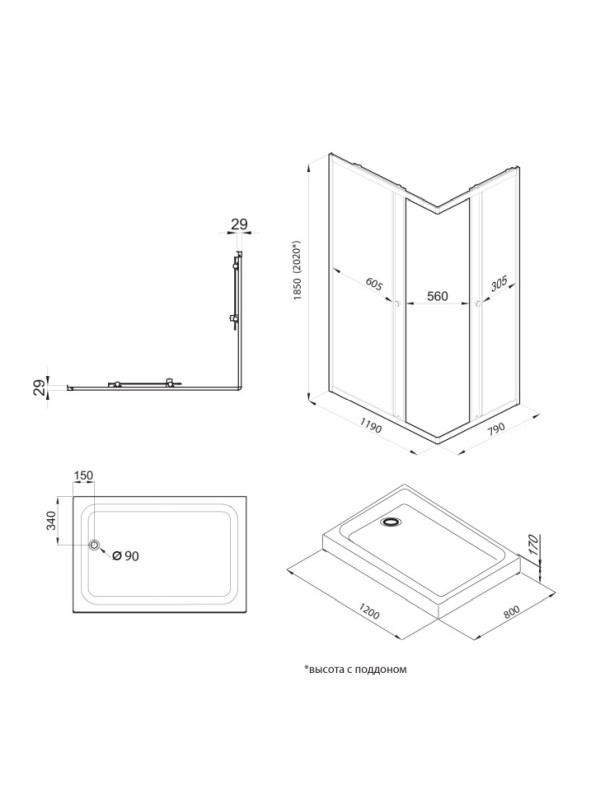 Высота кабины, поддона, мм 1850