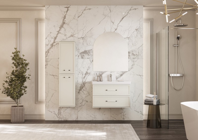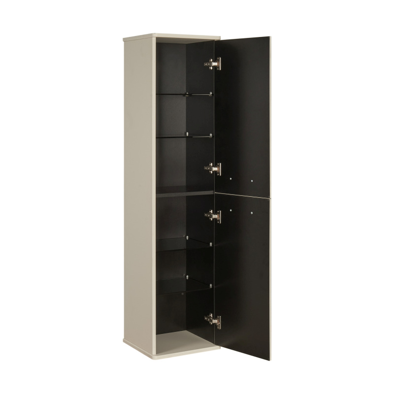 Шкаф-колонна изготовлена из высококачественной МДФ, покрытой матовой плёнкой. Фасады с фрезеровкой в рамочной форме гармонично сочетаются с остальными предметами этой коллекции. В колонне за фасадами-створками скрываются полочки из затемненного стекла, они установлены на специальных держателях, которые предотвращают опрокидывание. Фасады открываются при помощи удобной ручки, а благодаря петлям с доводчиками обеспечивается плавное закрытие, что гарантирует бесшумность и комфорт использования мебели. Продуманная эргономика позволит рационально использовать вместительное пространство за фасадами-створками, а регулируемые полочки не ограничивает высоту ванных принадлежностей. Скрытая от глаз косметика, гигиенические принадлежности создают в помещении уют.