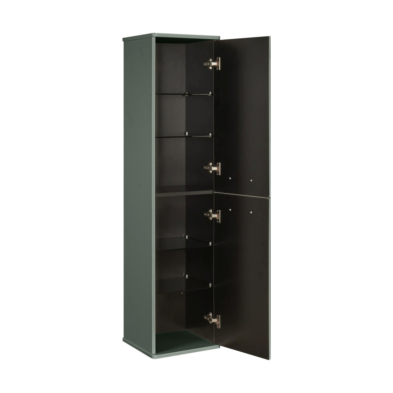 Шкаф-колонна изготовлена из высококачественной МДФ, покрытой матовой плёнкой. Фасады с фрезеровкой в рамочной форме гармонично сочетаются с остальными предметами этой коллекции. В колонне за фасадами-створками скрываются полочки из затемненного стекла, они установлены на специальных держателях, которые предотвращают опрокидывание. Фасады открываются при помощи удобной ручки, а благодаря петлям с доводчиками обеспечивается плавное закрытие, что гарантирует бесшумность и комфорт использования мебели. Продуманная эргономика позволит рационально использовать вместительное пространство за фасадами-створками, а регулируемые полочки не ограничивает высоту ванных принадлежностей. Скрытая от глаз косметика, гигиенические принадлежности создают в помещении уют.