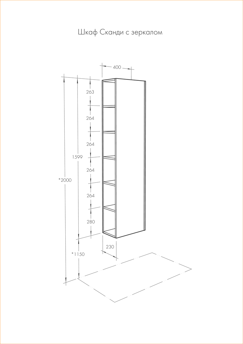 1 зеркальный фасад, 2 регулируемые полки из ВЛДСП.