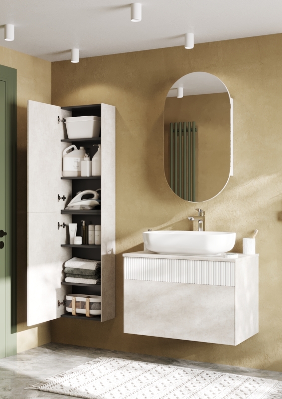 Дополняет коллекцию предметов мебели Марбл шкафчик в созвучном дизайне: боковые стенки и фасад выполнены из ВЛДСП Слэйт. Внутри две регулируемые полки из ламинированной влагостойкой ДСП в цвете антрацит - перекликаются с внутренним оформлением ящиков тумб коллекции Марбл. Навесной шкафчик имеет как левую, так и правую ориентации - достаточно лишь перевернуть изделие на 180 градусов. При желании также можно собрать полноценную колонну из двух навесных шкафов.