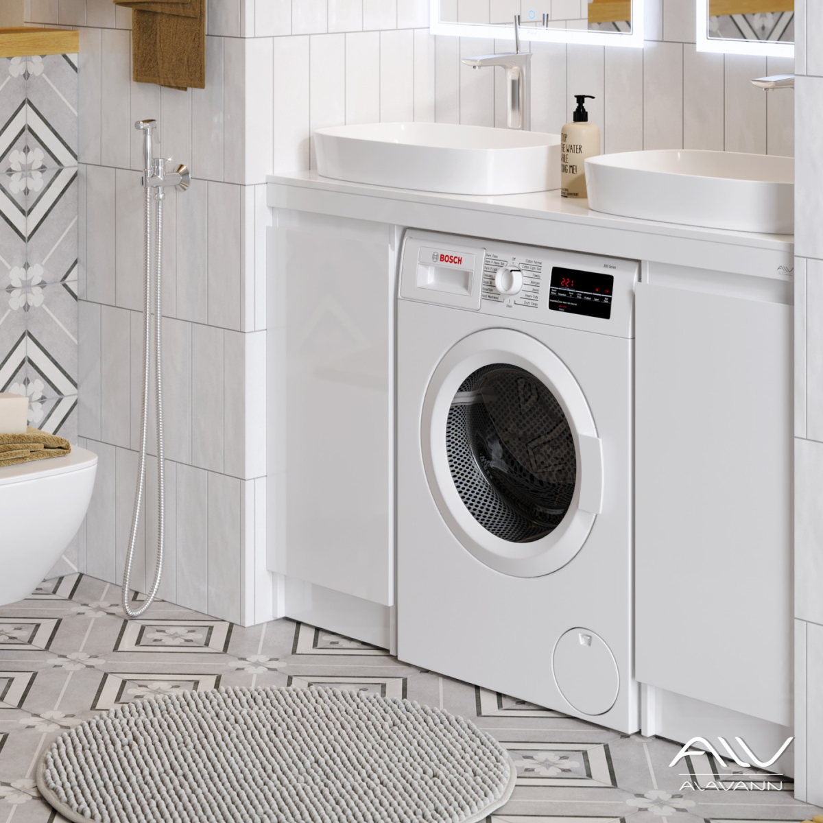 Двойная тумба под стиральную машину комплектуется двумя умывальниками Купер 56 (производство: Kirovit Россия). Возможно различное исполнение столешницы: крашеный МДФ, МДФ со шпоном, а также столешница из камня. Толщина столешницы 60 мм.
