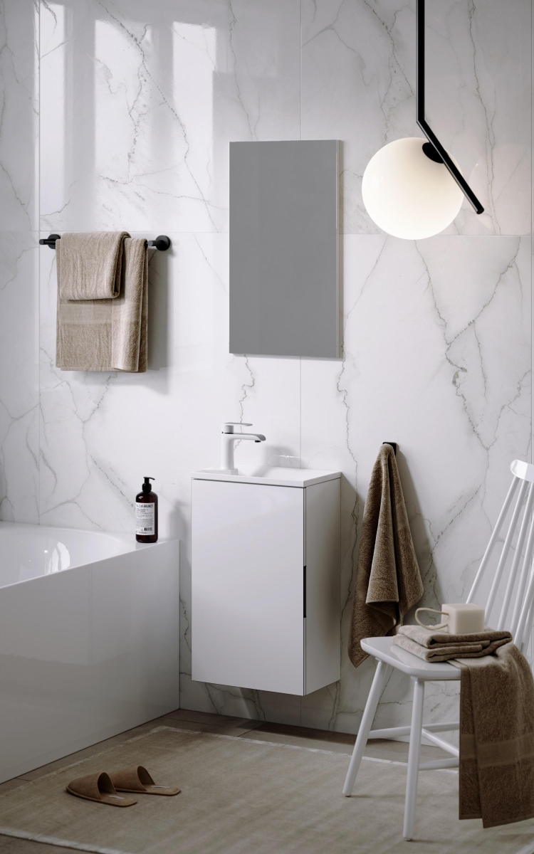 Подвесная тумба с одной универсальной левой/правой дверью с умывальником из литьевого мрамора Malaga 420