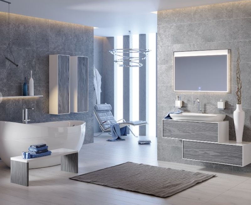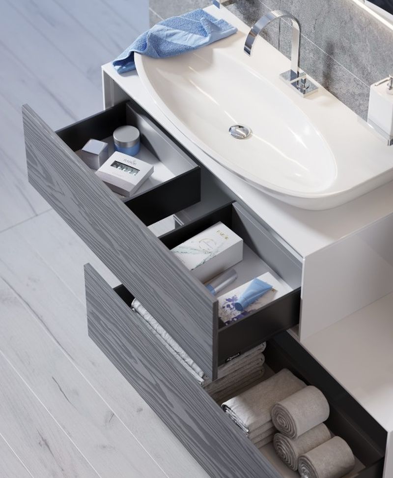 Дизайнеры все чаще обращаются к природным фактурам в предметах интерьеров ванных комнат. Мебель Genesis может комплектоваться фасадами из ЛДСП с глубокой фактурой дерева от итальянского производителя Cleaf – цвет миллениум серый (MG), а также в белом глянце (W) – фасады из МДФ (древесноволокнистой плиты повышенной плотности) покрыты эмалью в 5 слоев. Корпус из МДФ покрыт 5 слоями белой глянцевой эмали, а также усилен алюминиевыми профилями, исключающими возможность изменения геометрии мебели. Столешница, на которую устанавливается умывальник из литьевого мрамора, дополнительно покрыта защитным лаком, устойчивым к механическим воздействиям. Тумба оборудована ящиком полного выдвижения LegraBox с инновационной системой Tip-On Blumotion австрийской фирмы «Blum». Эта система совмещает в себе функцию открытия нажатием и плавного закрывания. Боковины ящиков LegraBox - металлические, толщиной всего 12 мм. Внутри ящиков находятся антискользящие коврики.