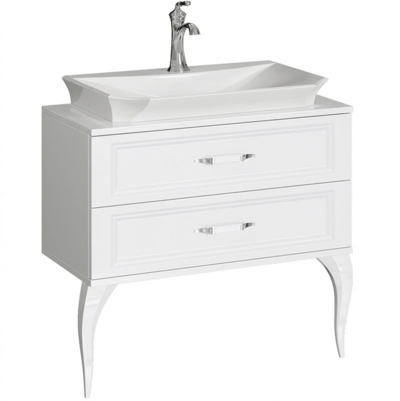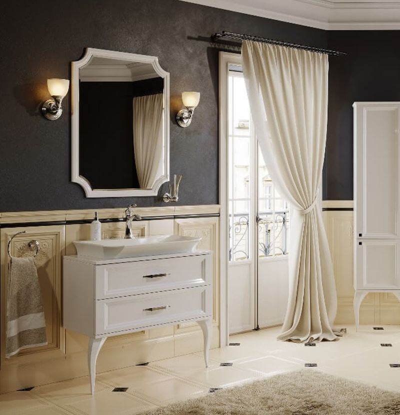 овременные технологические возможности и неоклассические формы сочетает в себе коллекция мебели La Donna. Напольная тумба в размере 85 см комплектуется наставным умывальником из литьевого мрамора. Зеркало имеет криволинейную форму с огранкой по краю (фацет). Фасады и корпус мебели изготовлены из высококачественного МДФ (древесноволокнистой плиты повышенной плотности) и покрыты пятью слоями белой глянцевой или черной матовой эмали. Тумба с двумя ящиками на направляющих полного выдвижения LegraBox от австрийской фирмы «Blum», которые имеют функцию мягкого закрывания и гарантию на весь срок службы мебели. Боковины ящиков LegraBox — металлические, толщиной всего 12мм. Внутри ящиков лежат антискользящие коврики белого цвета. Ножки у тумб из массива натурального дерева. Мебельные ручки от европейского производителя с отделкой хром.