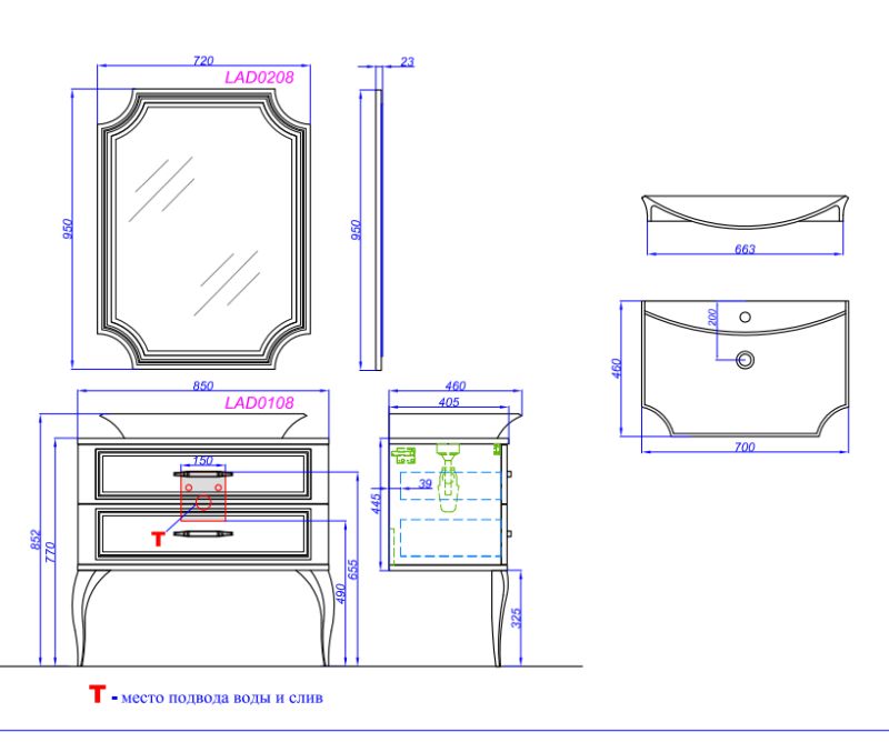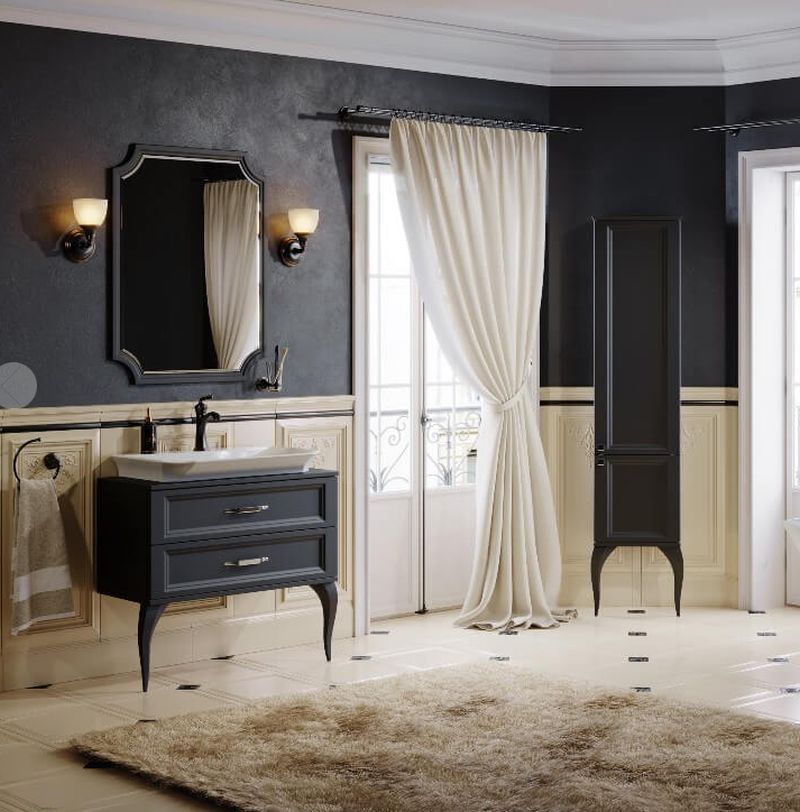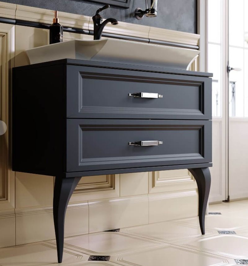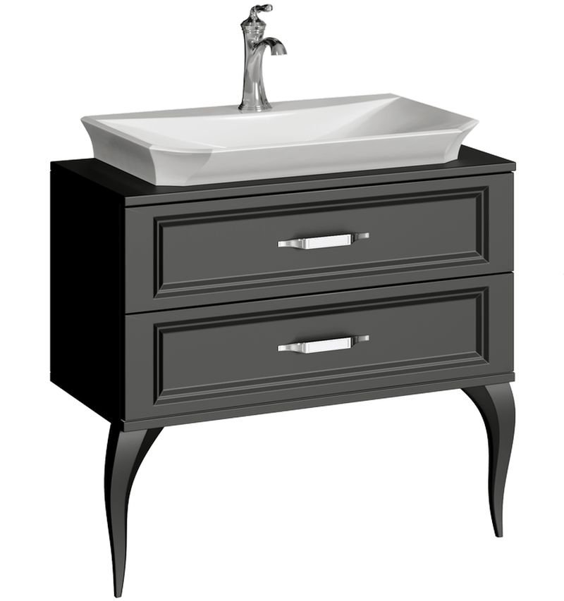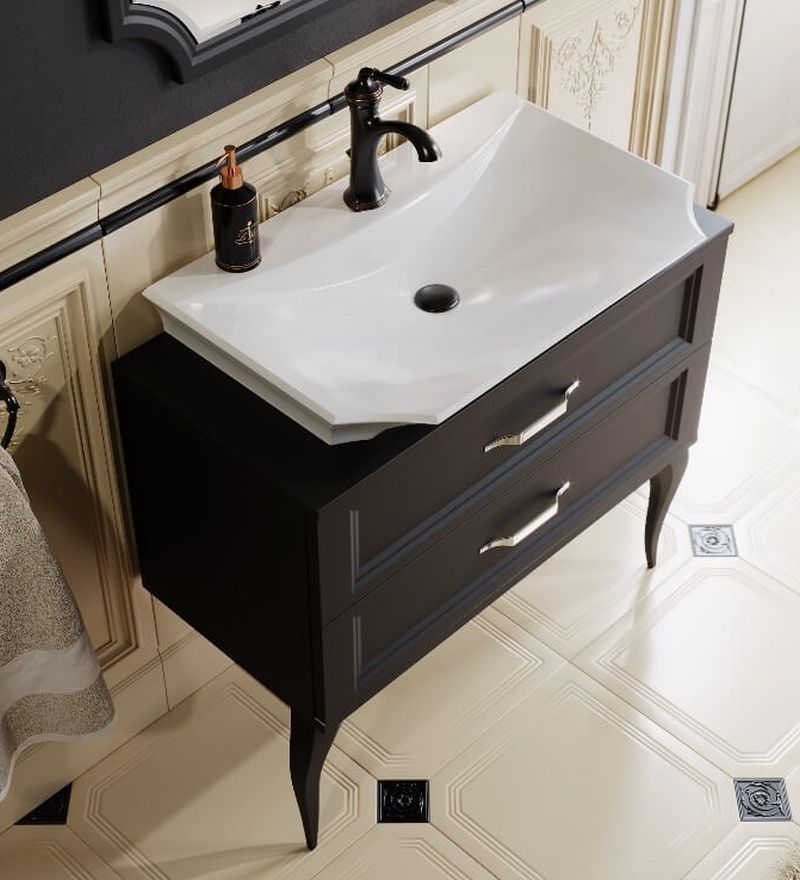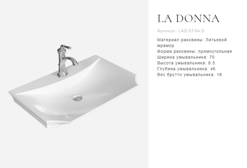 овременные технологические возможности и неоклассические формы сочетает в себе коллекция мебели La Donna. Напольная тумба в размере 85 см комплектуется наставным умывальником из литьевого мрамора. Зеркало имеет криволинейную форму с огранкой по краю (фацет). Фасады и корпус мебели изготовлены из высококачественного МДФ (древесноволокнистой плиты повышенной плотности) и покрыты пятью слоями белой глянцевой или черной матовой эмали. Тумба с двумя ящиками на направляющих полного выдвижения LegraBox от австрийской фирмы «Blum», которые имеют функцию мягкого закрывания и гарантию на весь срок службы мебели. Боковины ящиков LegraBox — металлические, толщиной всего 12мм. Внутри ящиков лежат антискользящие коврики белого цвета. Ножки у тумб из массива натурального дерева. Мебельные ручки от европейского производителя с отделкой хром.