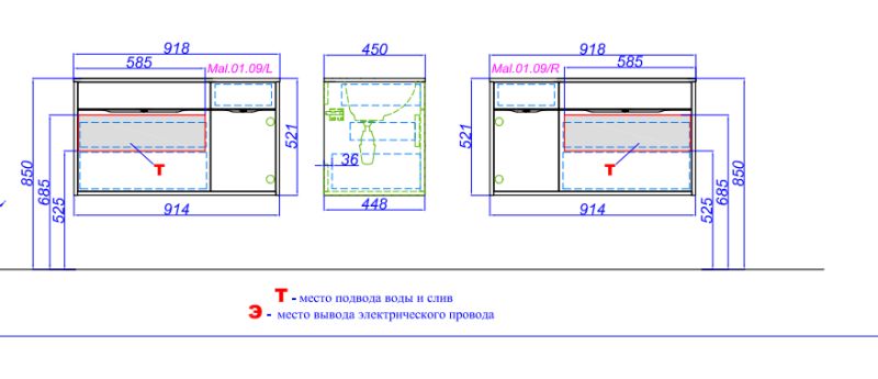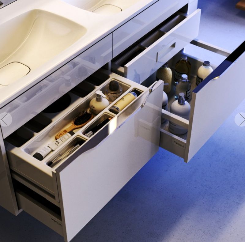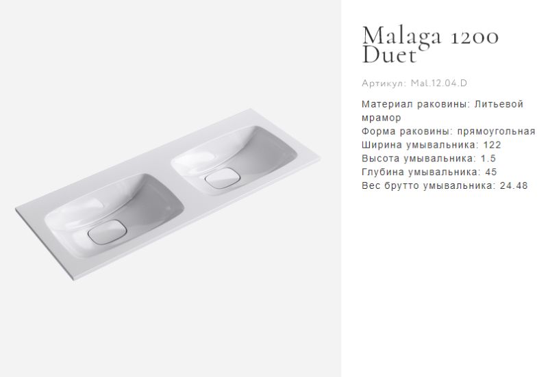 Серия Malaga отличается высокой эргономичностью благодаря применению технологических достижений в производстве мебели. Направляющие полного выдвижения от австрийской фирмы «Blum», которые имеют функцию мягкого закрывания и гарантию на весь срок службы мебели. Внутренние ящики с разделителями для удобного хранения мелочей. На дне основных ящиков - антискользящие коврики. Боковины мебели изготавливаются из МДФ (древесноволокнистой плиты повышенной плотности) и покрываются пятью слоями высокоглянцевой эмали белого цвета. Фасады возможны в двух исполнениях: из МДФ, окрашенные пятью слоями высокоглянцевой эмали белого цвета или из ЛДСП с глубокой фактурой дерева от итальянского производителя Cleaf в цвете крафт тёмный (CD). Хромированные ручки с логотипом AQWELLA. Гарнитуры комплектуются умывальниками из литьевого мрамора