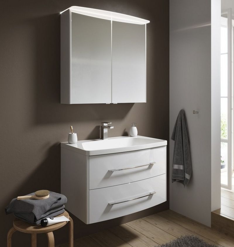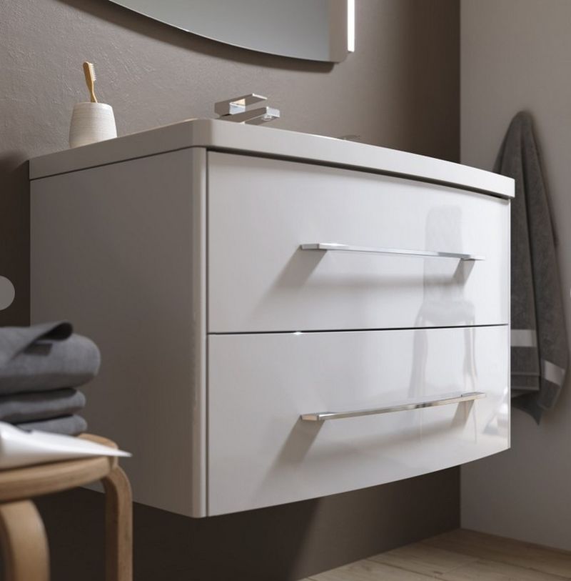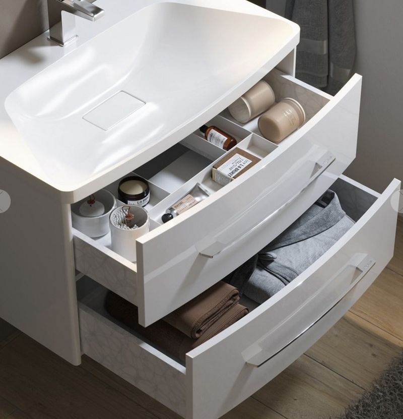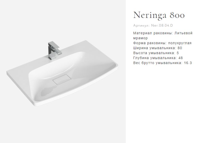 Основным предметом коллекции Neringa является подвесная тумба шириной 80 см с изогнутым фасадом. При изготовлении мебели используется МДФ, покрытая пятью слоями глянцевой эмали. В верхнем ящике установлен пластиковый лоточек с тремя отсеками для хранения. Направляющие ящиков австрийского производителя Blum имеют бессрочную гарантию. Ящики закрываются плавно и мягко. Внутренняя отделка выполнена особым цветом (Eolo), имитирующим ткань. Мебель комплектуется эксклюзивным умывальником с чашей в форме трапеции. Передний бортик повторяет изогнутую форму фасада. Место слива закрыто декоративной вставкой. Материал умывальника – литьевой мрамор. На металлической хромированной ручке выполнена гравировка с логотипом AQWELLA.