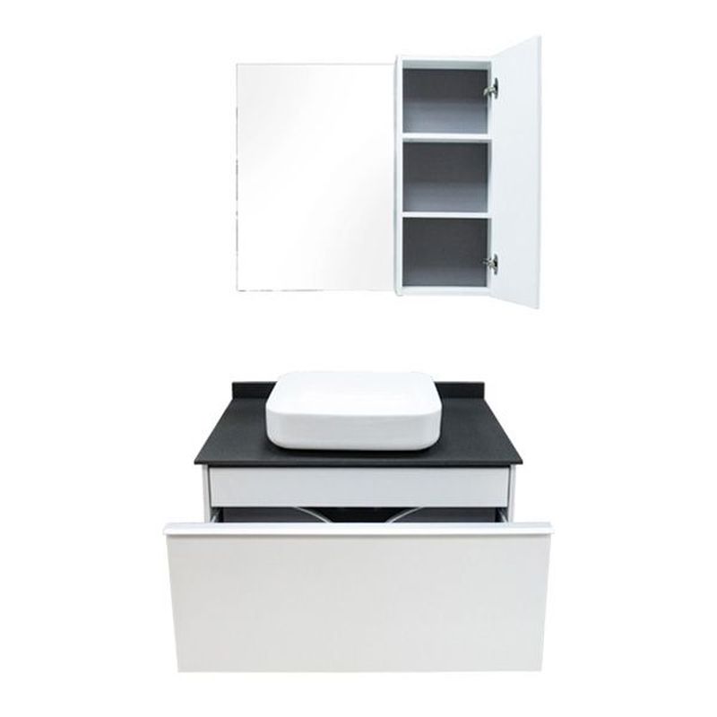 Подвесная тумба-умывальник с одним большим выкатным ящиком оснащенным системой плавного закрывания и внутренним ящиком оснащенным системой push-to-open (открытие при нажатии). Фасады покрыты белой глянцевой эмалью.
