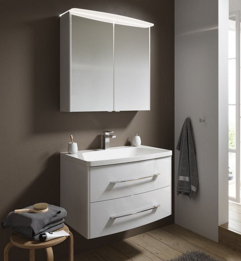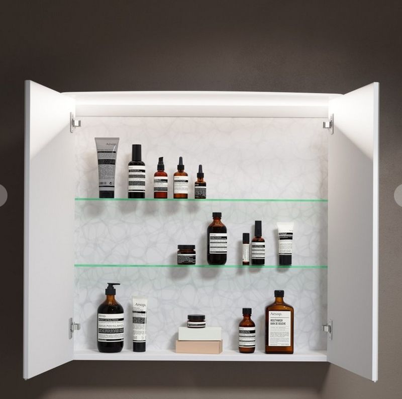 Зеркальный шкаф с двумя дверьми, светодиодным светильником, также освещающим внутреннее пространство, сенсорным выключателем и регулятором освещенности