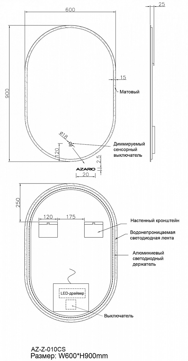 Зеркало AZARIO оснащено LED подсветкой и сенсорным выключателем с функцией плавного диммирования. Короткие касания выключателя меняют яркость свечения. Толщина зеркала 5 мм, что делает его надежным и прочным. Класс защиты IP44- это позволяет использовать электроприбор во влажном помещении.
