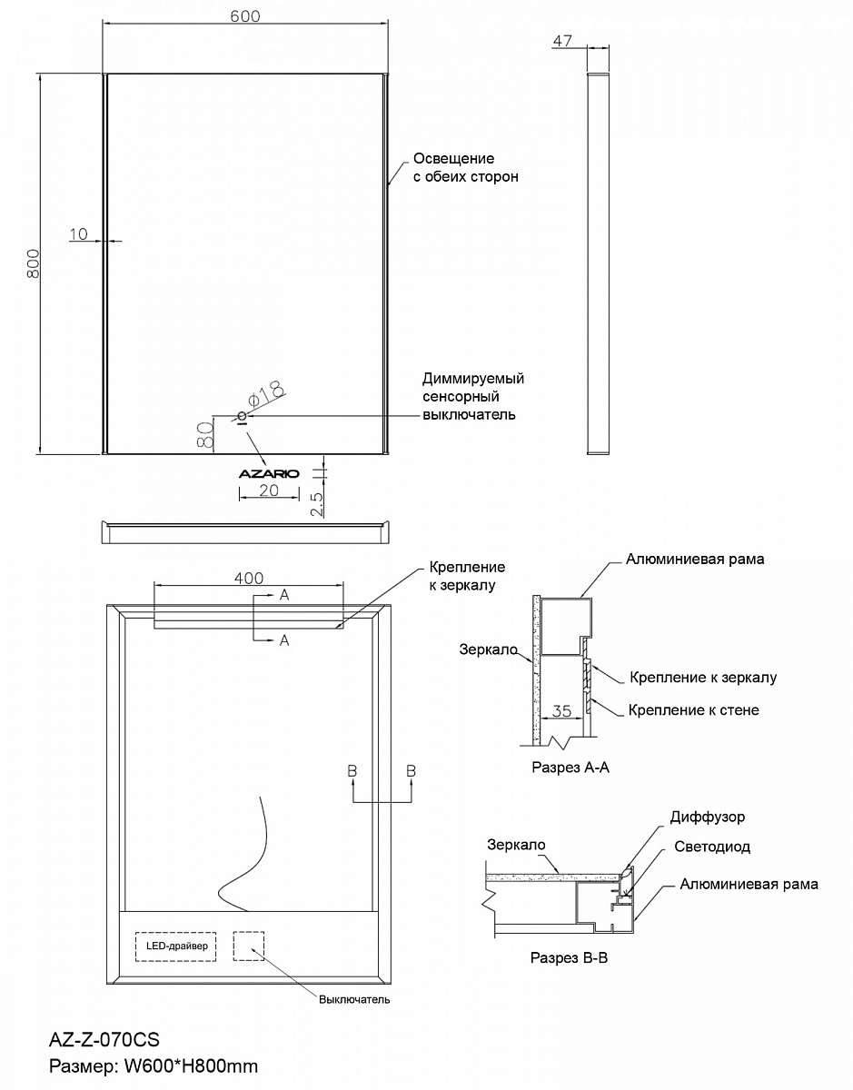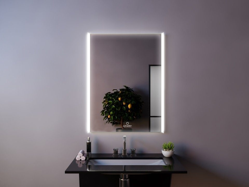 Зеркало AZARIO оснащено LED подсветкой и сенсорным выключателем с функцией плавного диммирования. Короткие касания выключателя меняют яркость свечения. Толщина зеркала 5 мм, что делает его надежным и прочным. Класс защиты IP44- это позволяет использовать электроприбор во влажном помещении.