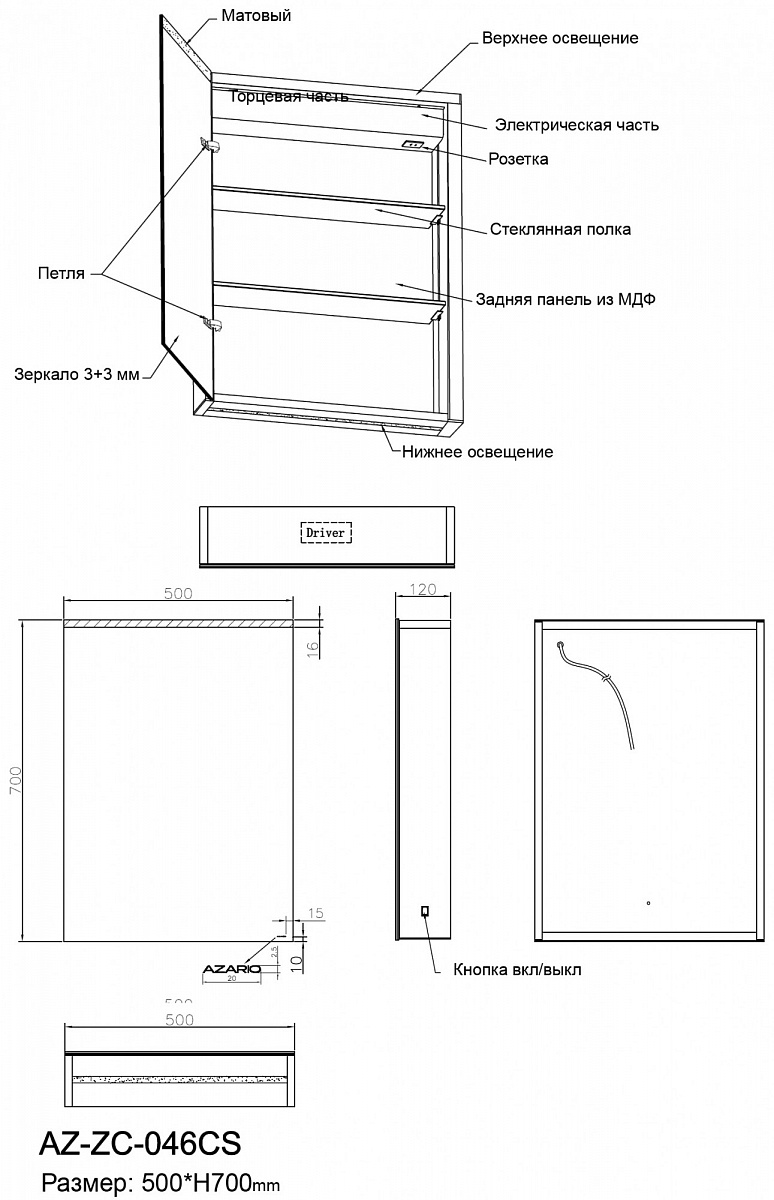 AZARIO зеркало-шкаф AZ-ZC-046CS изготовлен из серого алюминиевого корпуса, внутри розетка и 2 стеклянные полочки.