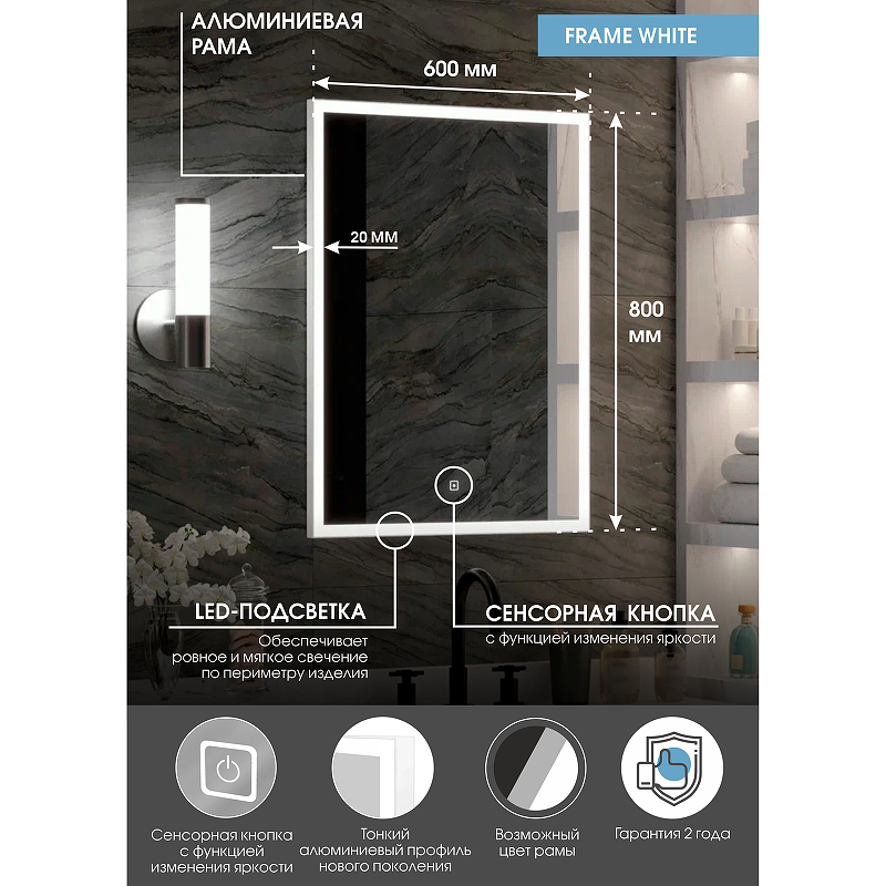Зеркало Континент Frame White с подсветкой с сенсорным выключателем.
