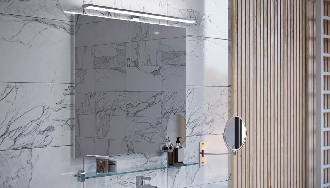 Материалы: зеркальное полотно, ЛДСП, LED-светильник, сенсорный включатель на взмах