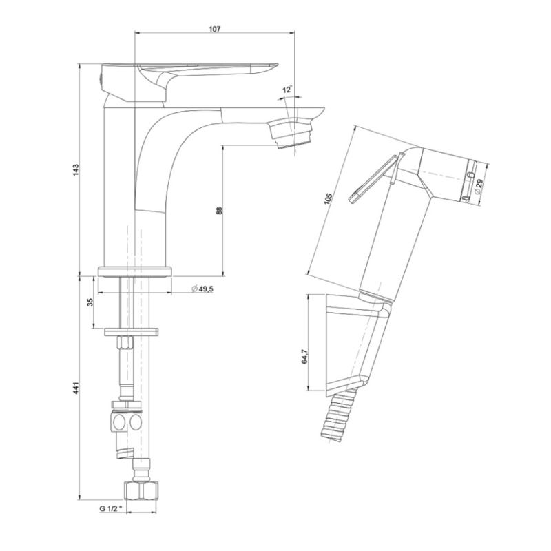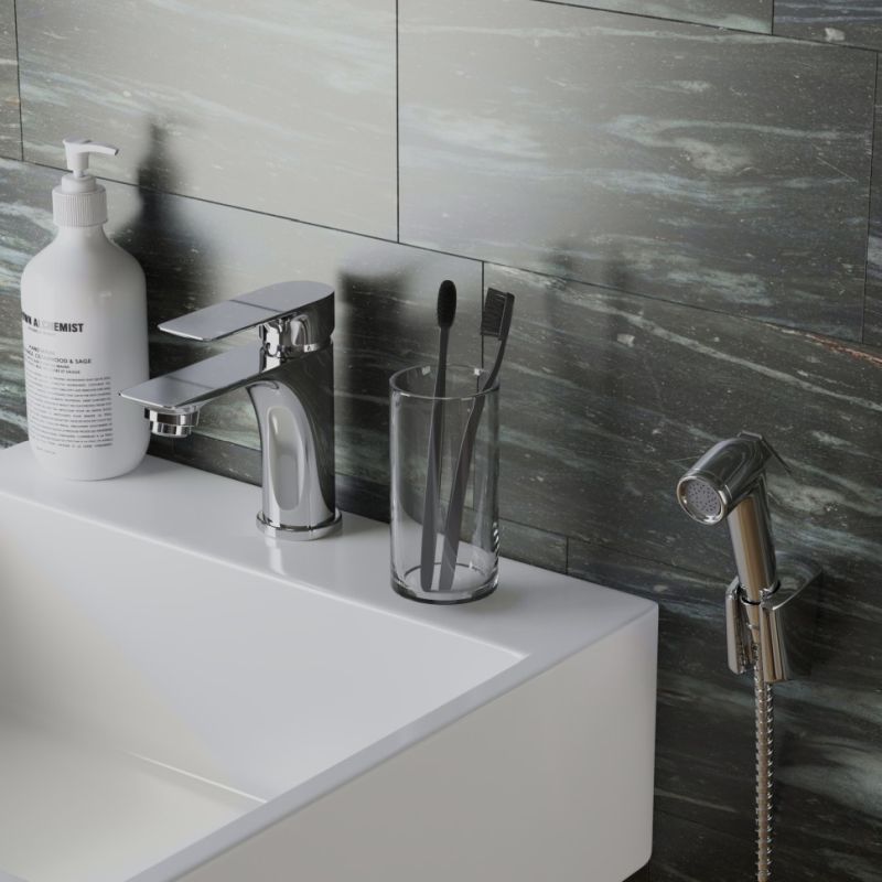 Это единое решение, позволяющее установить и смеситель, и гигиенический душ без сложного монтажа. Крепление смесителя выполняется напрямую к раковине, для лейки предусмотрен подвесной фиксатор.