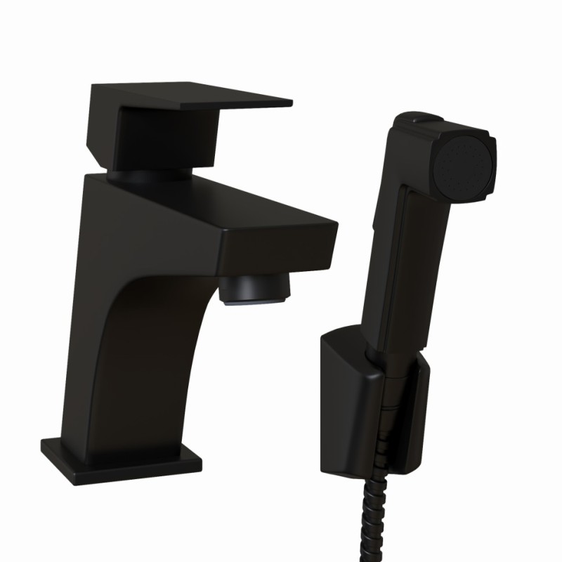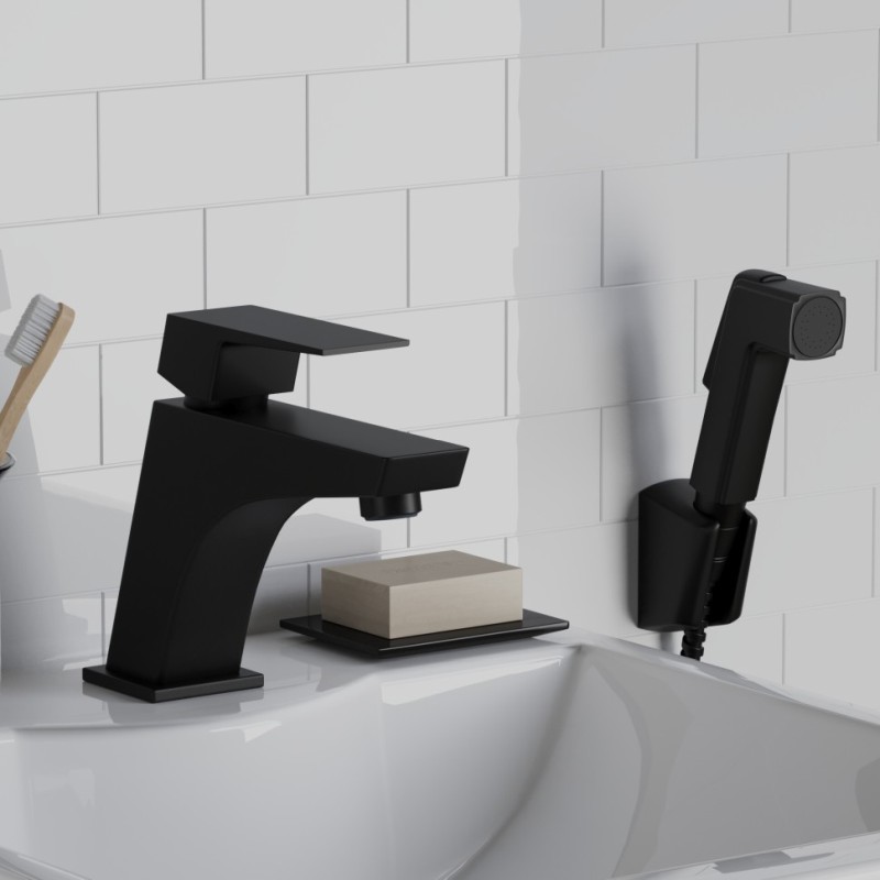 Это единое решение, позволяющее установить и смеситель, и гигиенический душ без сложного монтажа. Крепление смесителя выполняется напрямую к раковине, для лейки предусмотрен подвесной фиксатор.