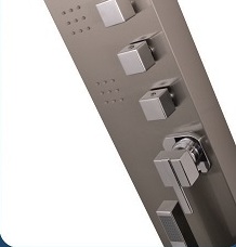 Душевая панель из нержавеющей стали "матовая", квадратный внутренний тропический душ, 4 квадратные внутренние форсунки гидромассажа спины, ручной душ со шлангом длиной 150 см, смеситель из меди на 3 позиции.