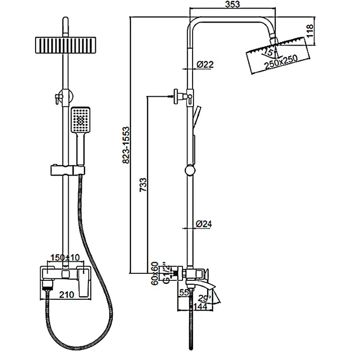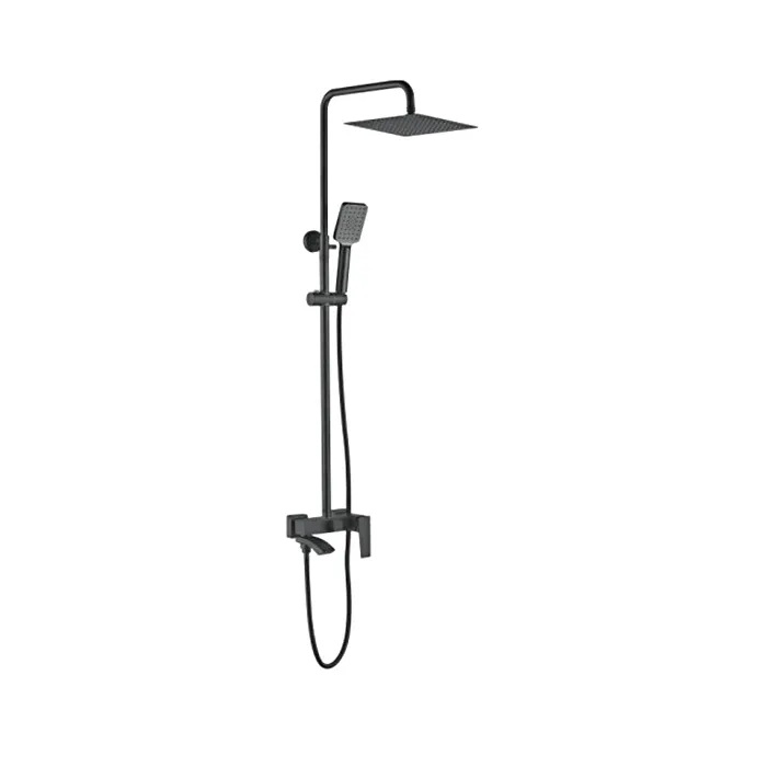 Смеситель; Душевая штанга; Душевой шланг; Тропическая лейка; Душевая лейка 3-х режимная; Держатель лейки; Верхний душ; Крепления