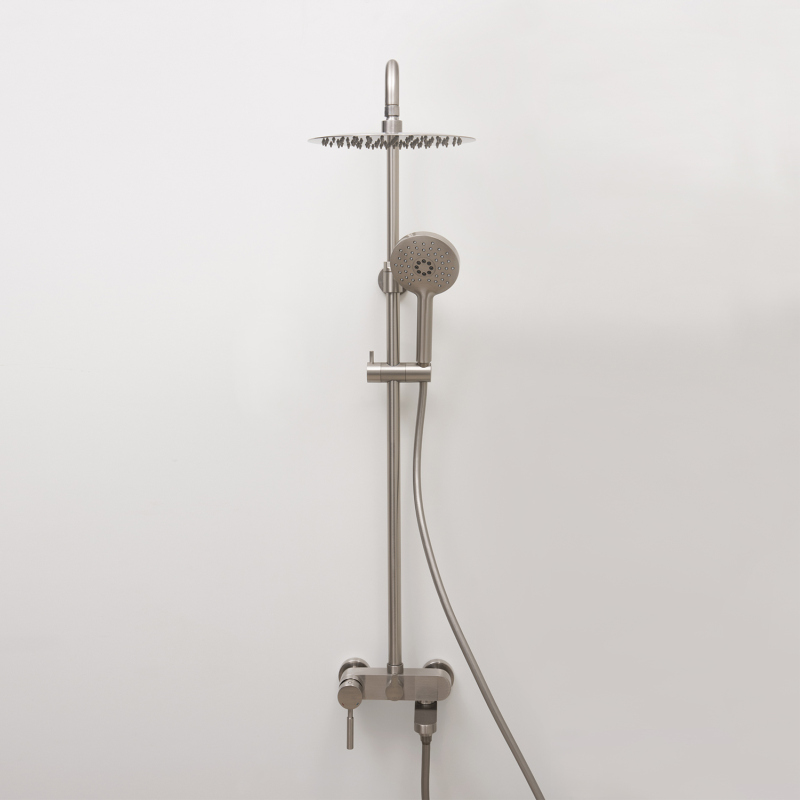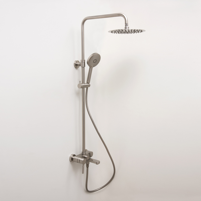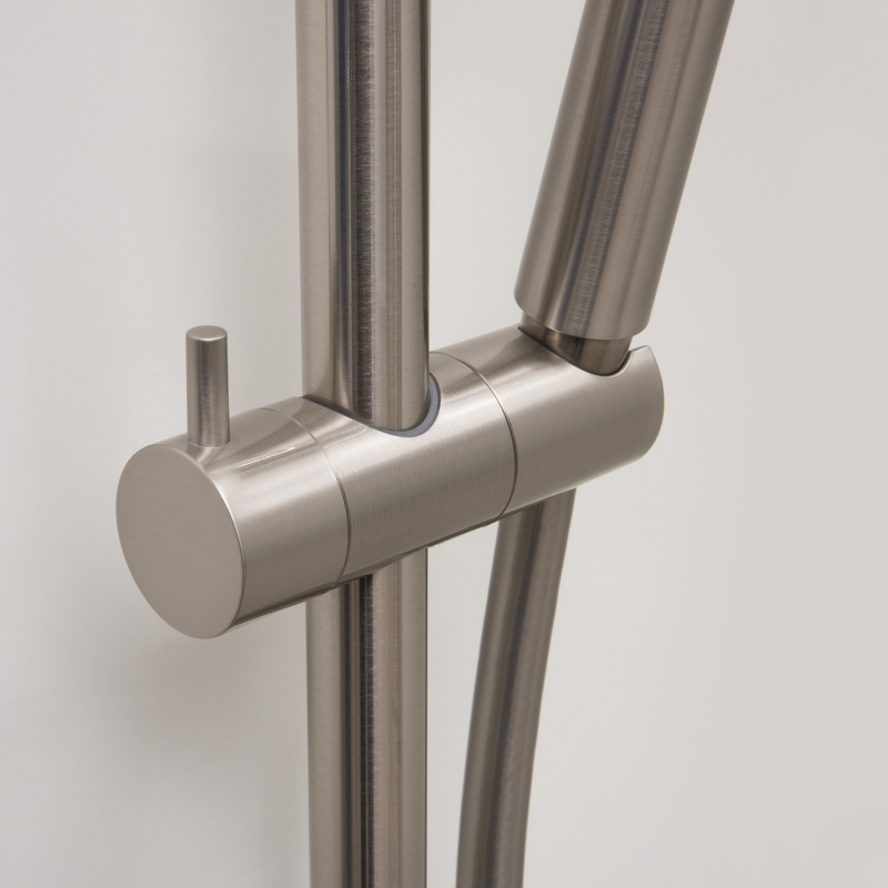 Стойку для душа можно регулировать по высоте. Для этого необходимо выдвинуть верхнюю часть стойки и зафиксировать на необходимой Вам высоте при помощи гайки верхнего крепления.
