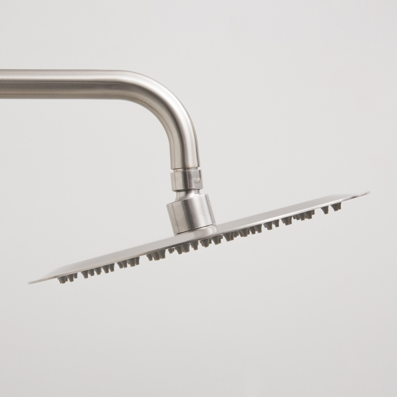 Душевая насадка производится из нержавеющей стали. Форсунки из силикона с системой защиты от известковых отложений. Насадка крепится к штанге при помощи шарнирного соединителя, внутрь которого встроен сетчатый аэратор для равномерного распределения воды. Также шарнирный соединитель позволяет менять угол наклона душевой насадки от 0 до 22 градусов.
