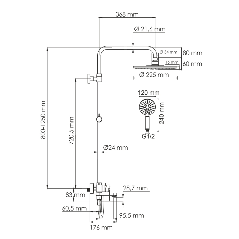 Стойка для душа, Ø 24 мм регулируемая по высоте