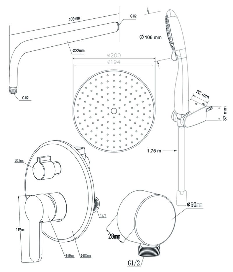 - верхний душ (душевая головка) с регулировкой наклона, настенный монтаж;