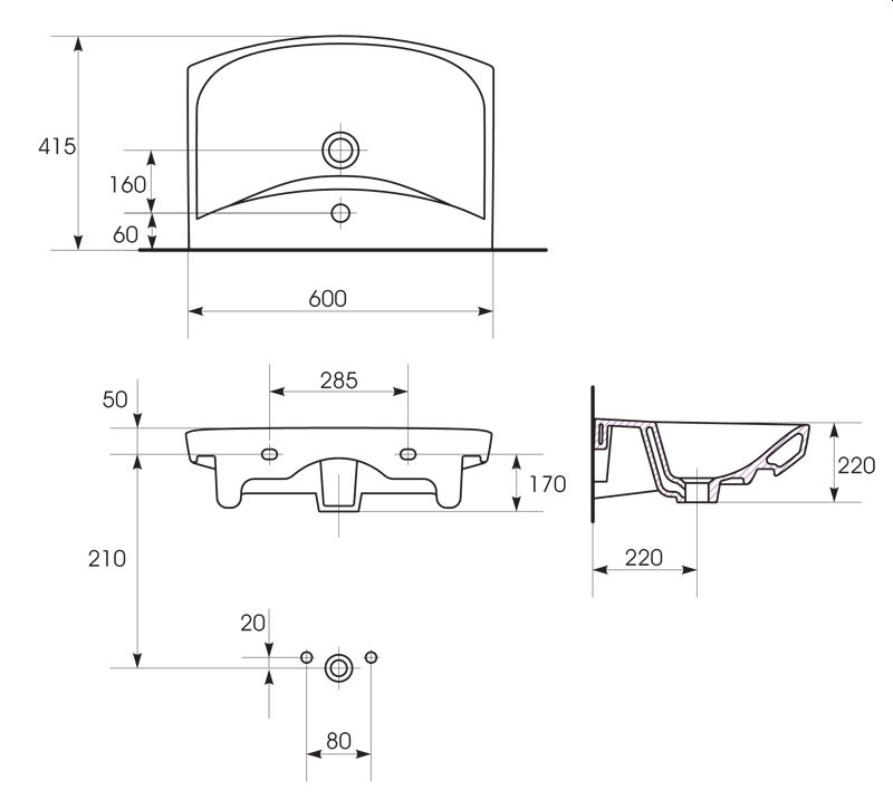 Прямоугольная подвесная, а также мебельная раковина CARINA с отверстием под смеситель, размером 60 см.