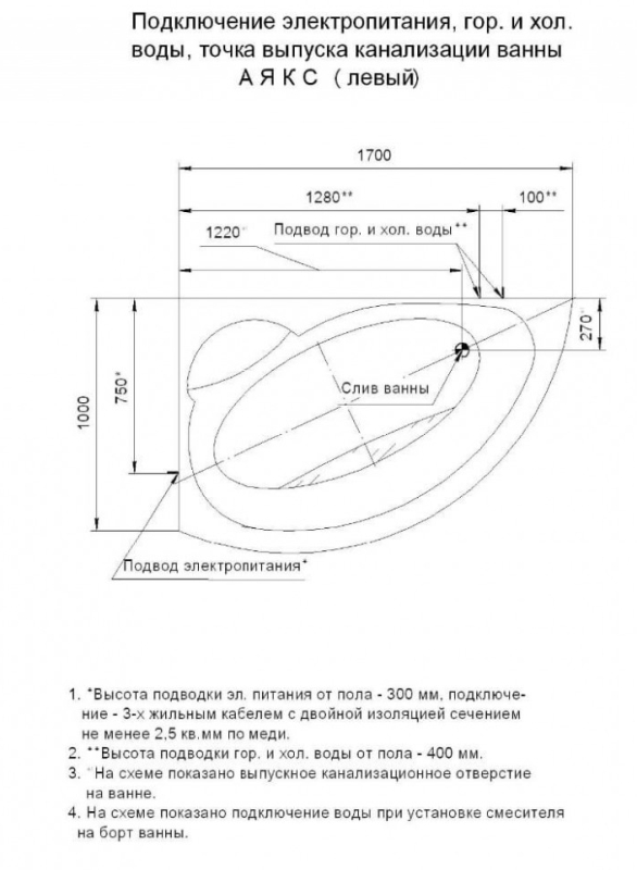 Асимметричная акриловая ванна Aquatek Аякс2 170*100 левая.