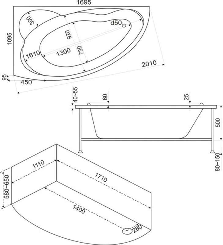 Высота ванны, мм 580-650