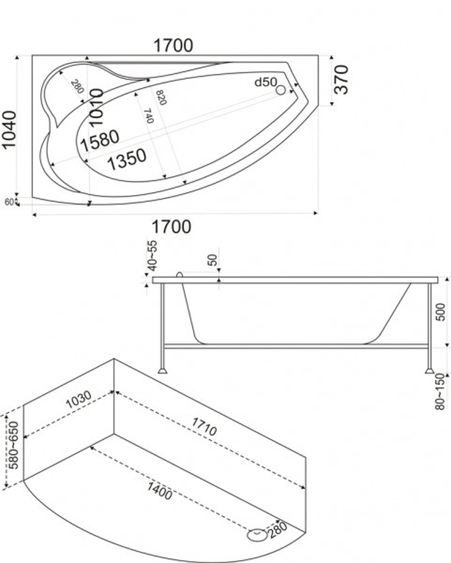 Асимметричная акриловая ванна BAS Николь 170*100 с усиленным каркасом.