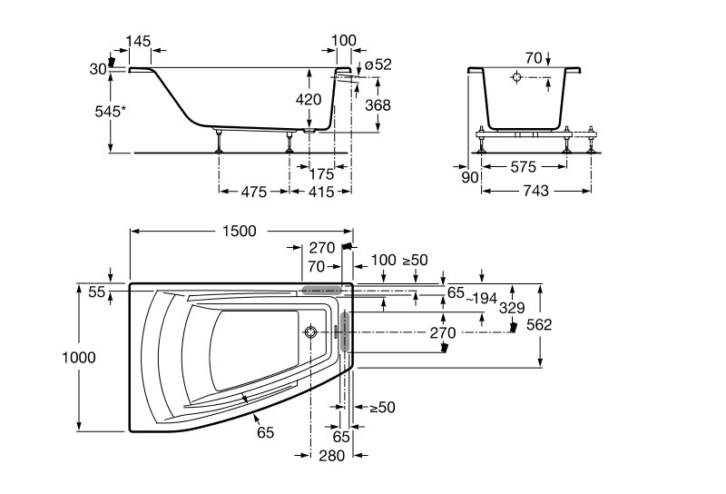 Высота ванны, мм 544