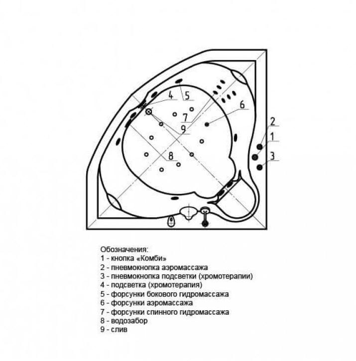 Ванна Aquatek Сириус пневматическое управление 164*164 гидромассажная