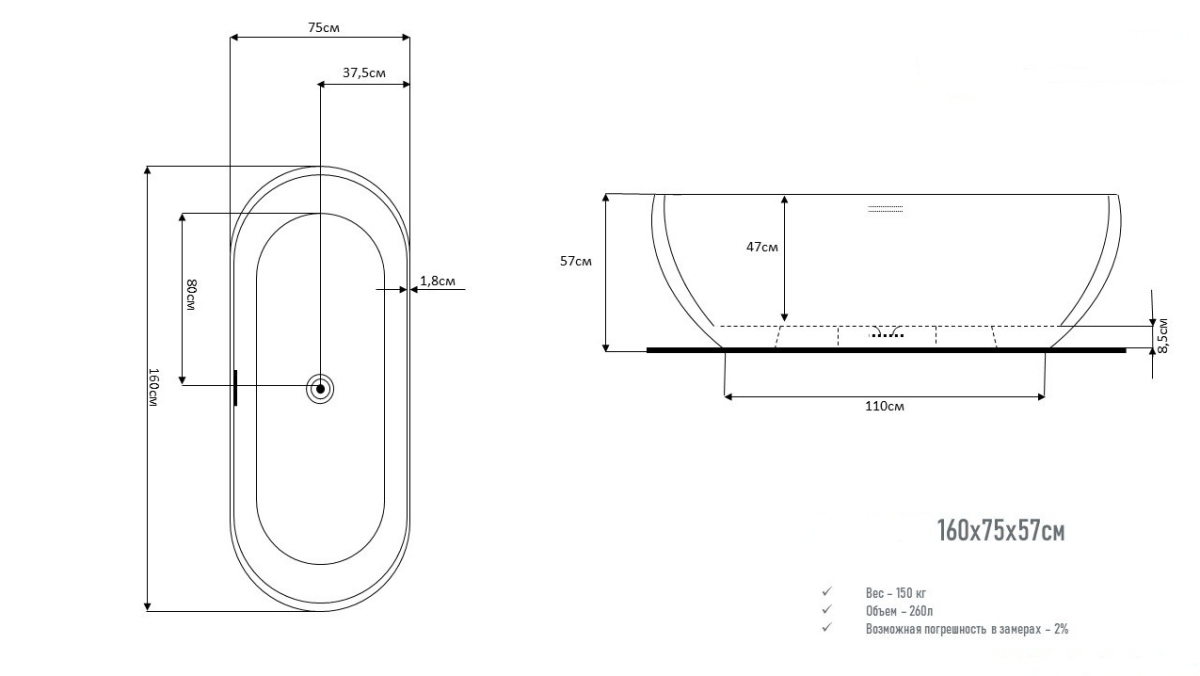 Размер ванны, см 160