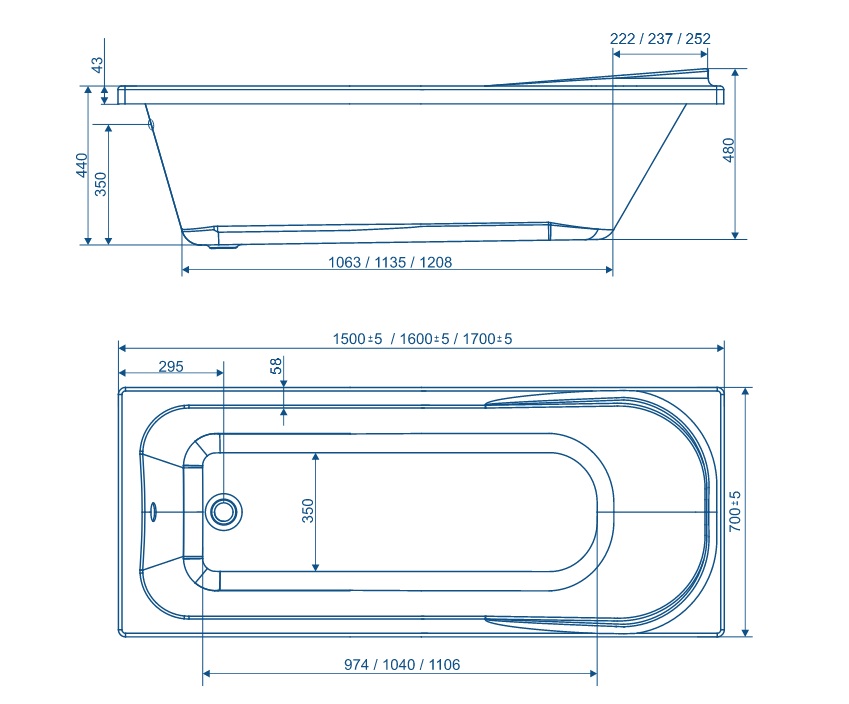 Коллекция представлена в трёх размерах 150х70, 160х70 и 170х70 см. Благодаря этому возможно подобрать оптимальное сочетание размера ванны под размеры любого санузла, при этом останется место для раковины, стиральной машины и других необходимых предметов интерьера.