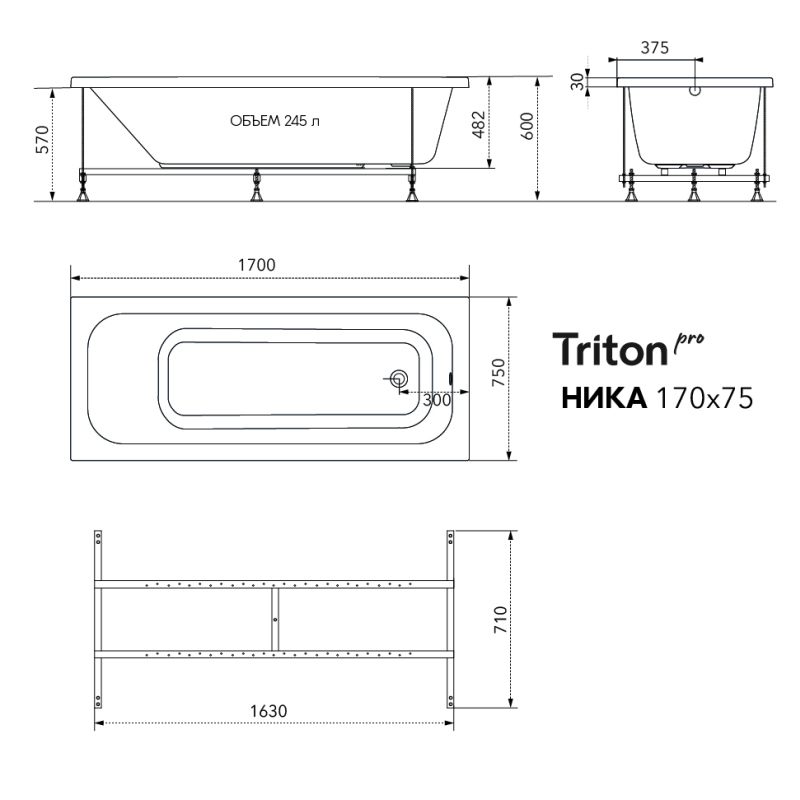 Ванна акриловая Тритон Ника 170*75, 180*80 + каркас