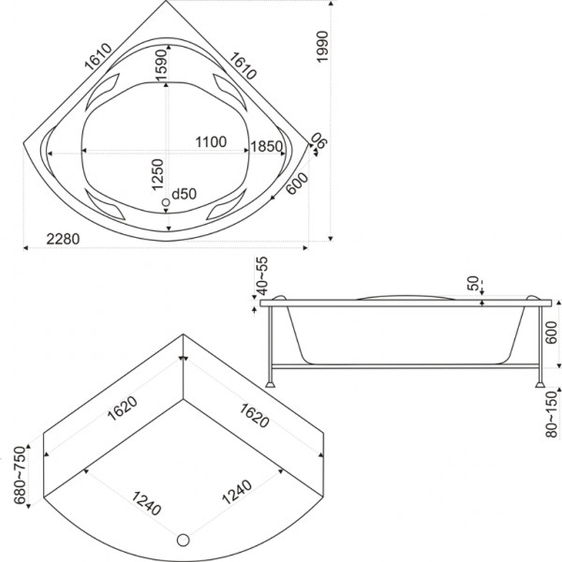 Угловая акриловая ванна BAS Ривьера 161*161 с усиленным каркасом.