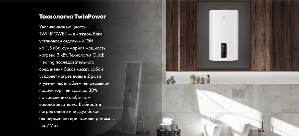• TWINPOWER мощность 3 кВт = 1,5 + 1,5 кВт ТЭНы в каждом баке.