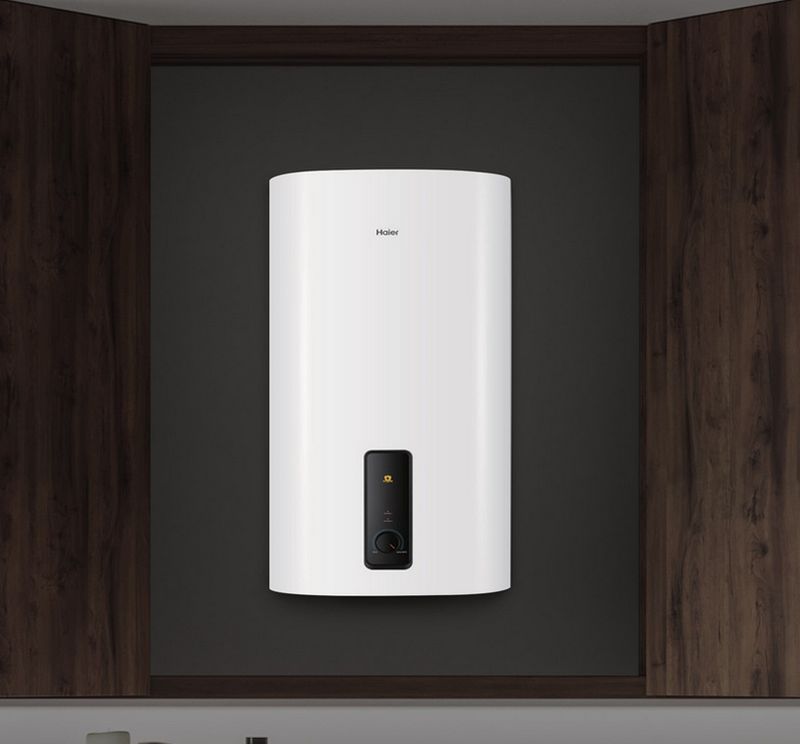 Электрический накопительный водонагреватель в плоском корпусе с двойным баком толщиной всего 29 см. В комплекте поставки с водонагревателем также идут крепежные материалы и предохранительный клапан.